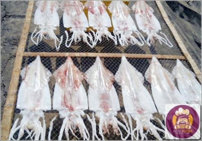 Cách làm khô mực trên lưới (kiểu lưới phơi sáng). Đối với hình thức phơi này, sau khi khô thân mực sẽ bị bè, thịt mỏng, vì thịt mỏng nên khi ăn sẽ mềm và dễ nhai hơn khô mực treo